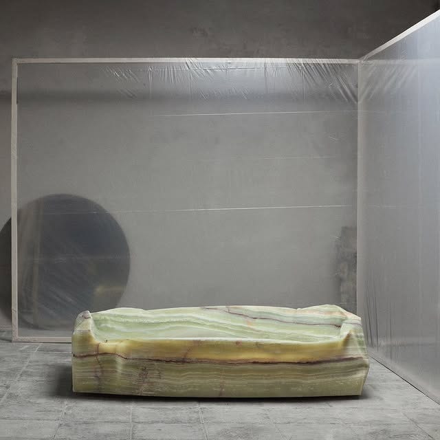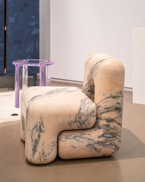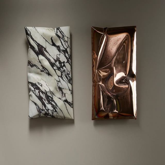 I first discovered Ben’s work at Baranzate Ateliers during Milan Design Week last year, and I was immediately blown away by how he transforms stone, glass, and metal into pieces like cushion sculptures with a slouchy, organic feel. His approach to blending traditional craftsmanship with modern techniques creates shapes that challenge expectations, and as he says himself, “by creating shapes that verge on the impossible, I confuse the viewers, make them lose their balance briefly, and stimulate them to look at familiar materials with a fresh eye.”