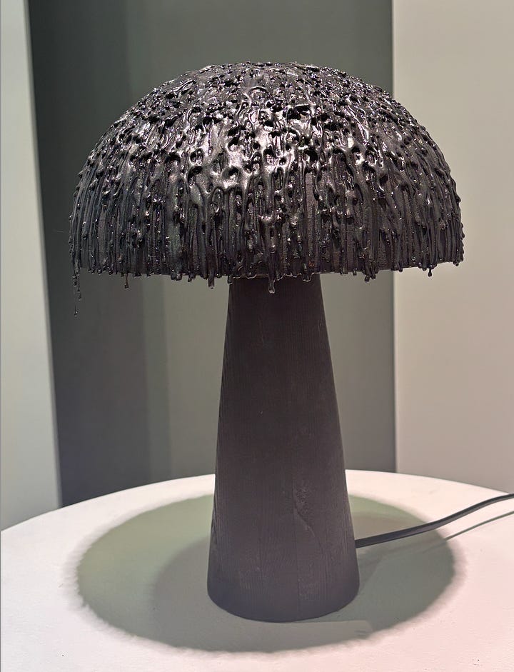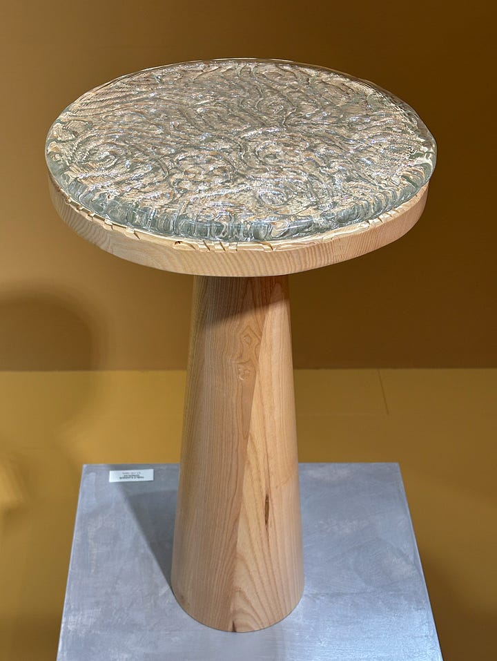 He developed the material Graphite Bioplastic, made from 100% natural ingredients with endless possibilities for shaping and molding. This made it possible that even drops are still “hanging” on the lamp. And then there was his "All Burnt Side Table" - molten glass is poured over a hand-carved wooden mold, burning it away and leaving behind the imprint of its texture in the solidified glass. Such a strong concept. I bet we’ll see more of him in the future.